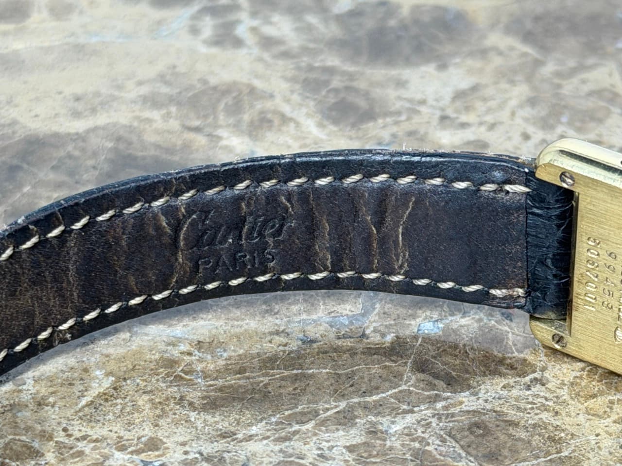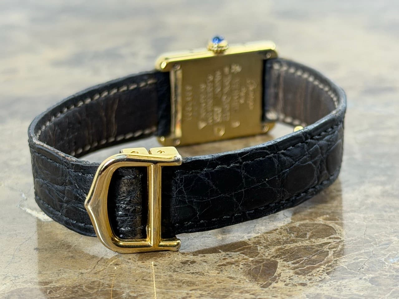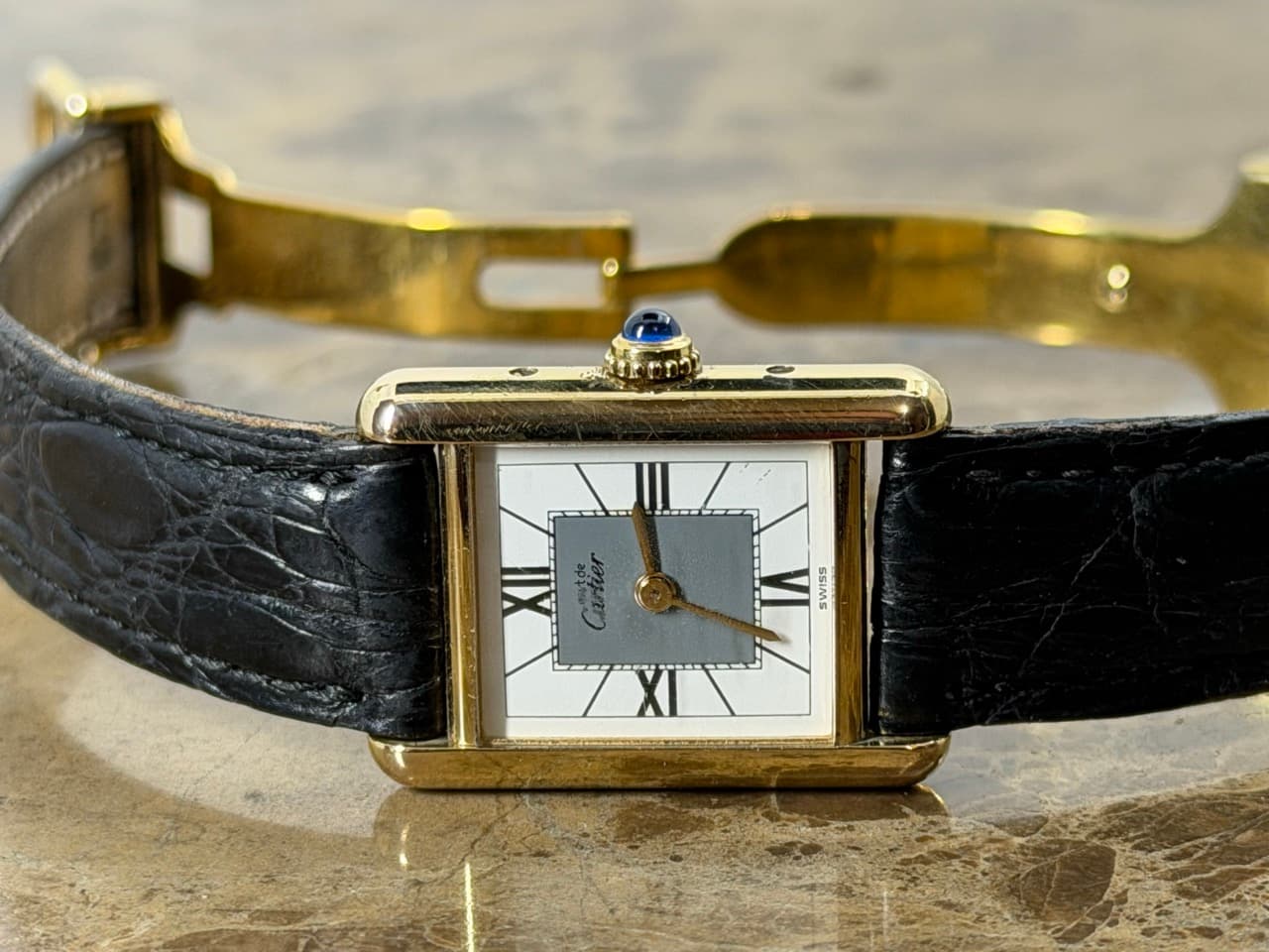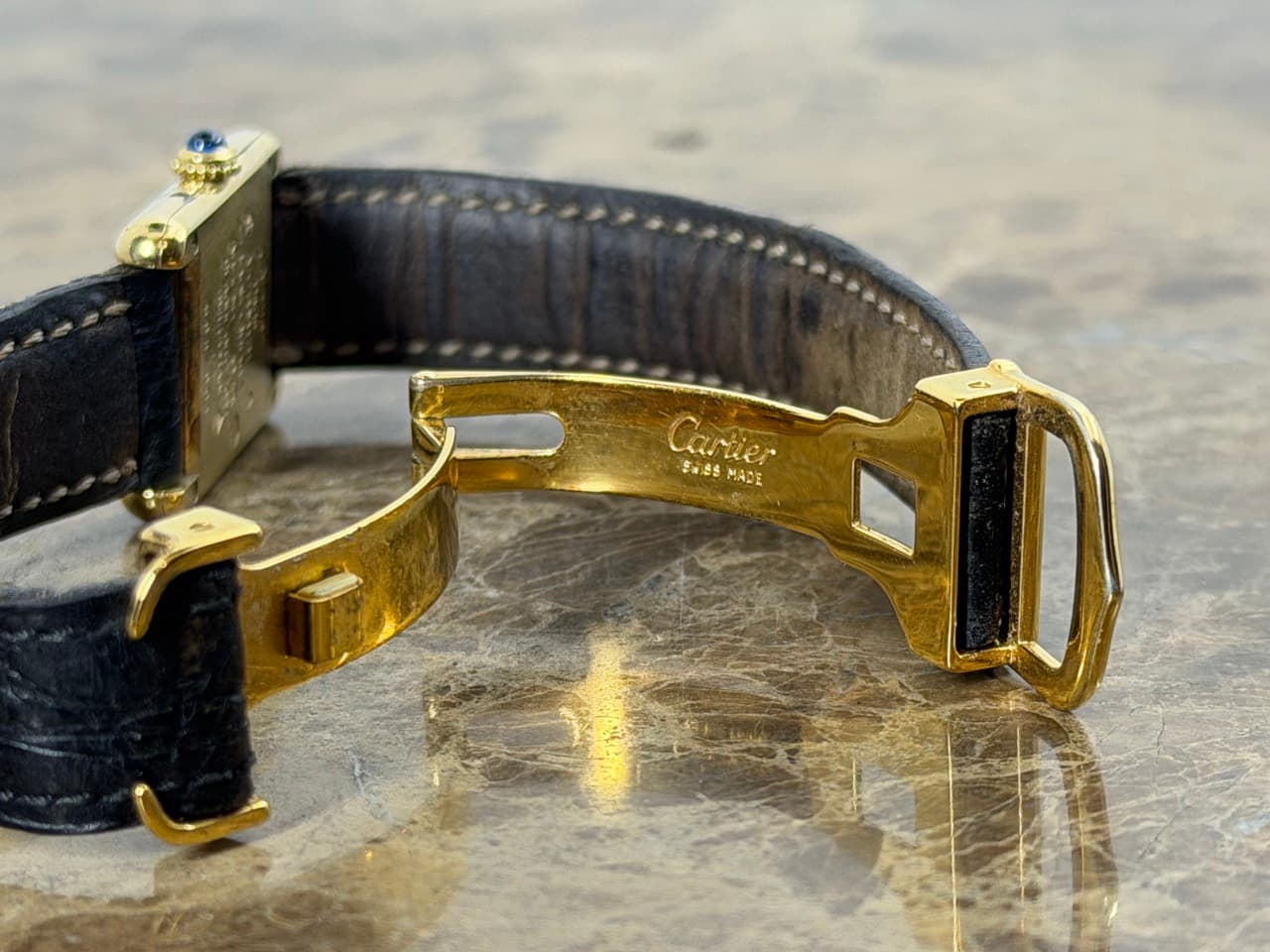 Strap – Cartier Black Leather Strap with a unique Cartier Gold Tone Deployed Buckle