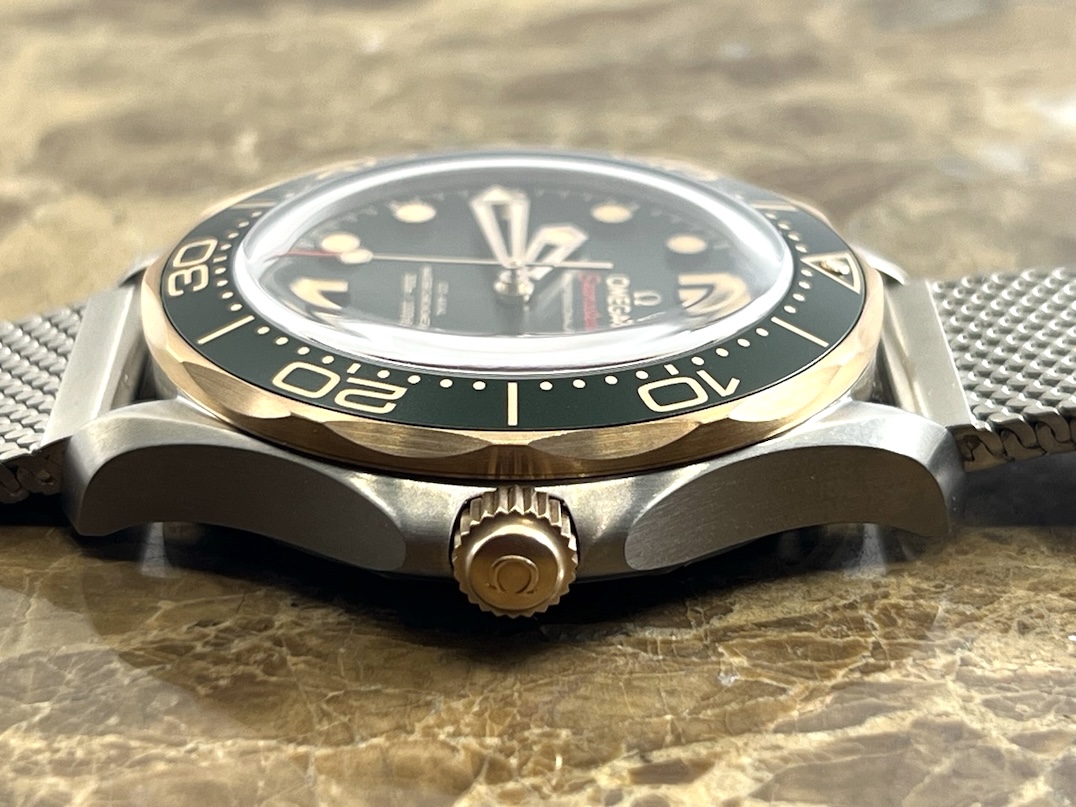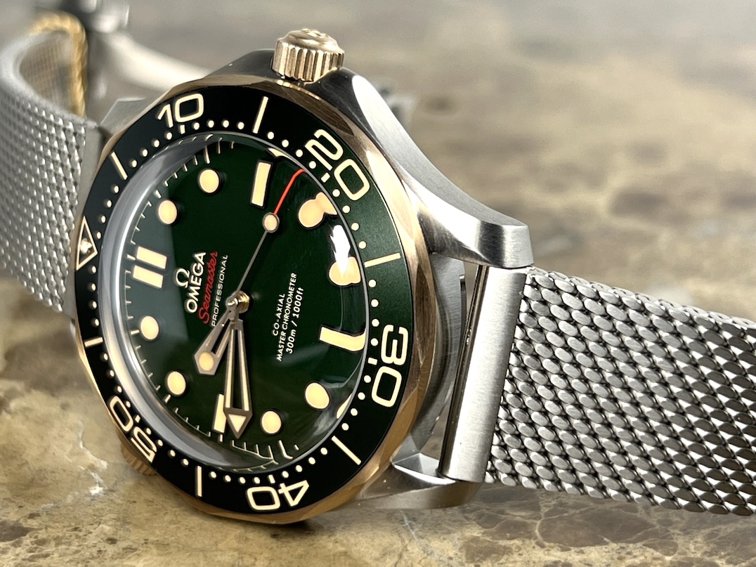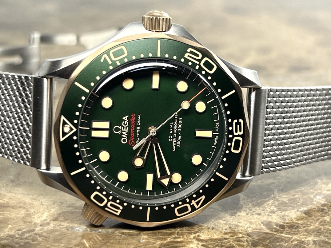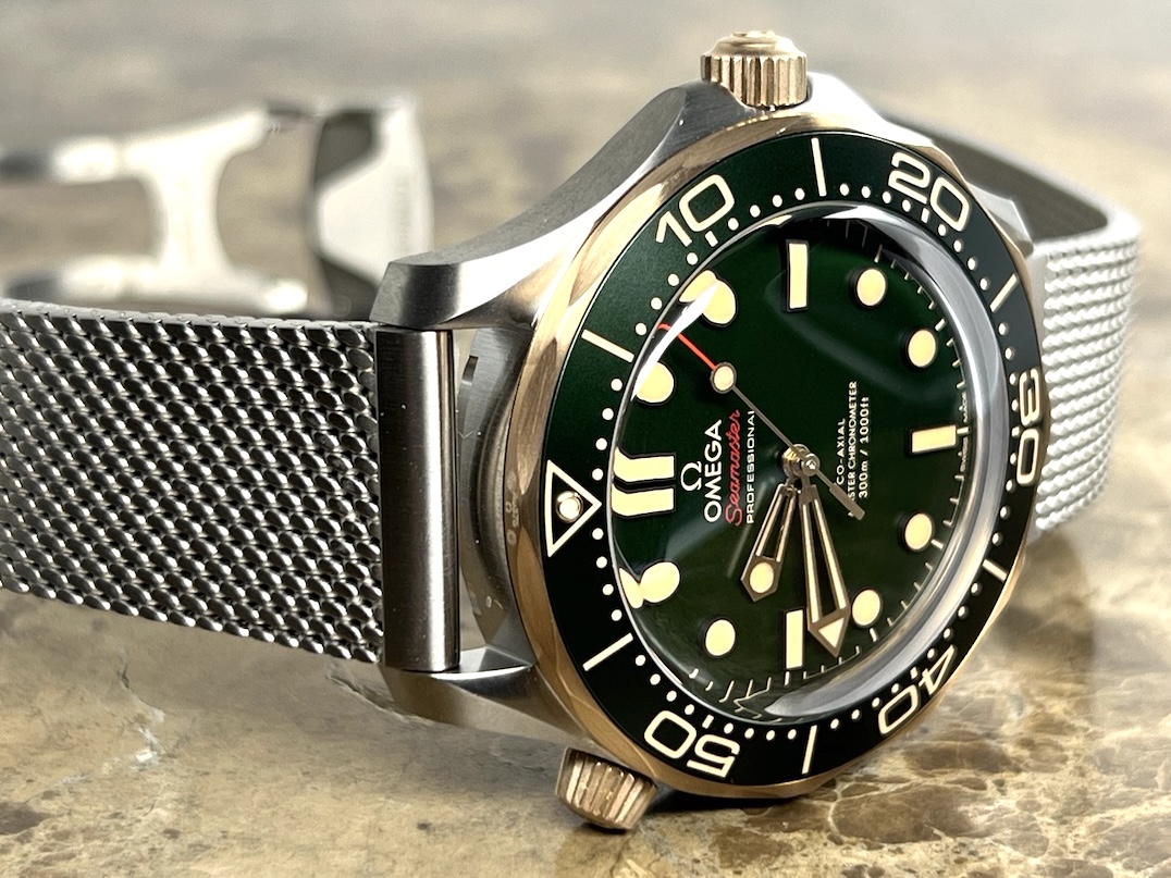 Omega Seamaster Diver 300M Automatic 42mm Green Dial Titanium Bronze Gold Mesh Bracelet Box Papers Cards 210.90.42.20.10.001 Year 2025