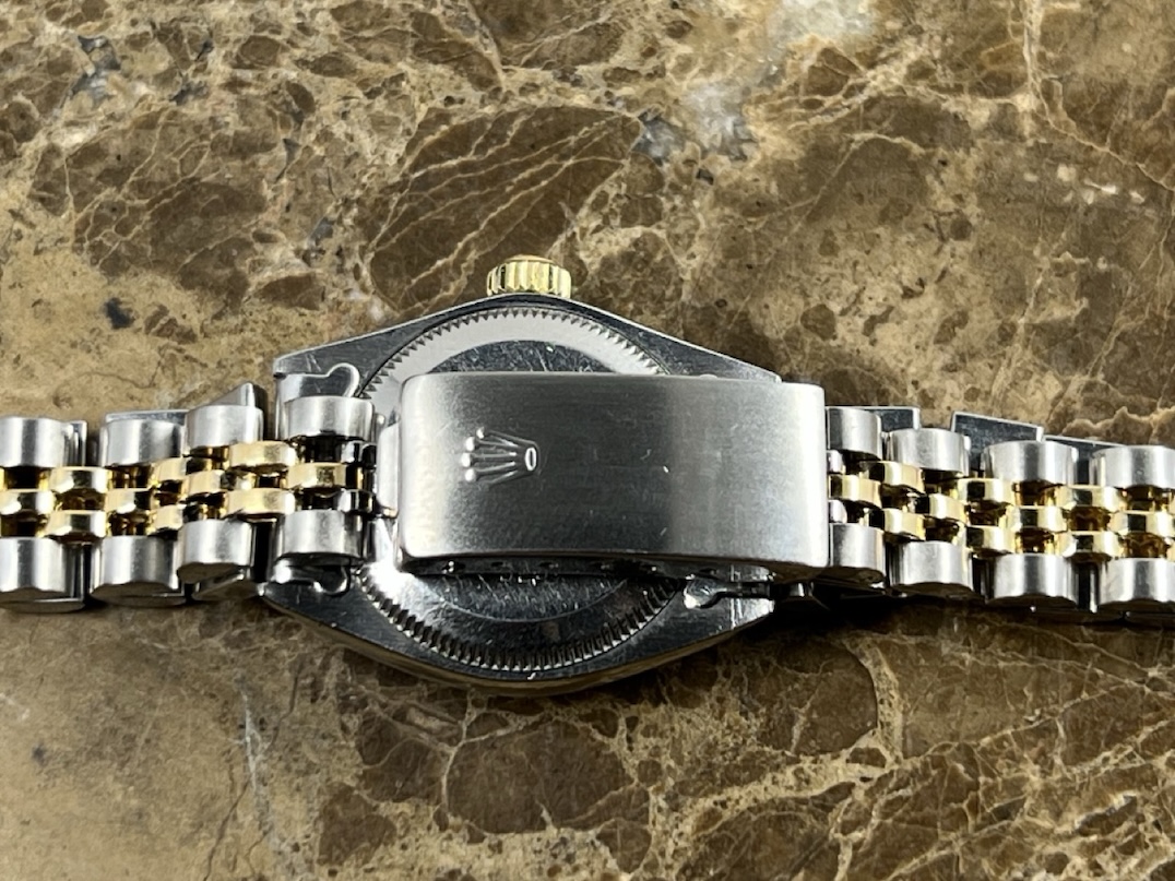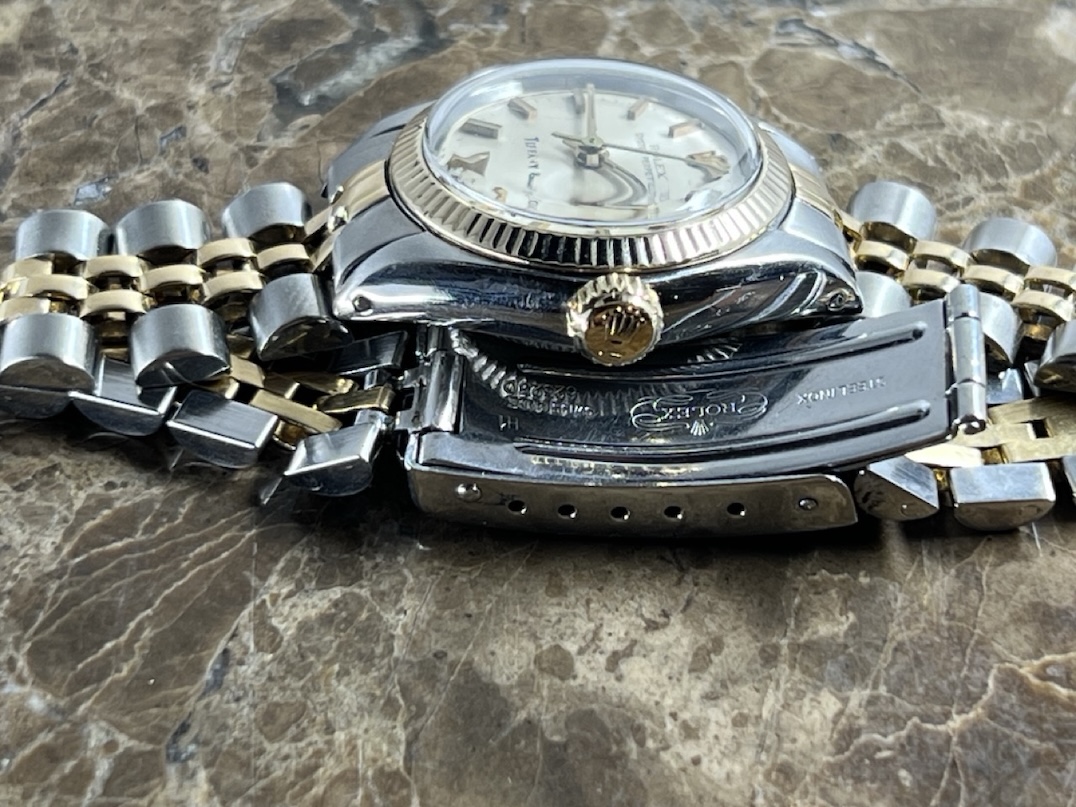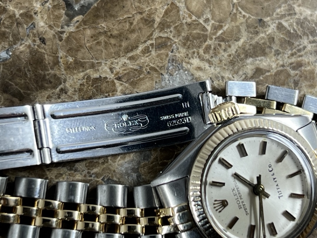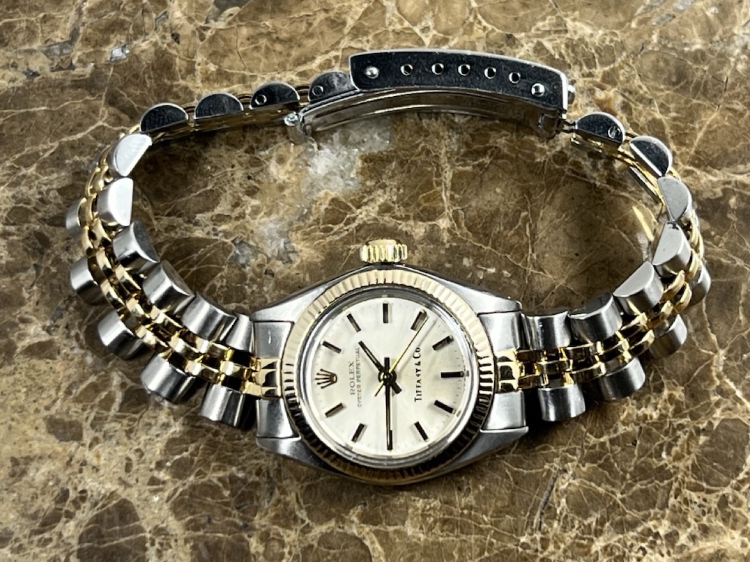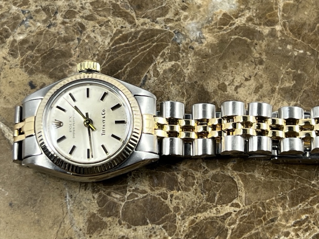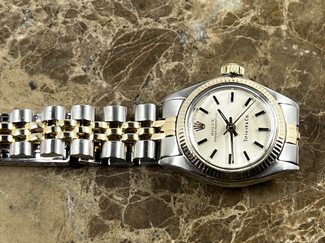 Rolex Lady Oyster Perpetual Automatic 24mm 18k Gold / Steel Jubilee Bracelet Silver Tiffany & Co Dial Fluted Bezel model 6719 Vintage